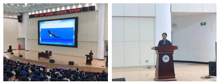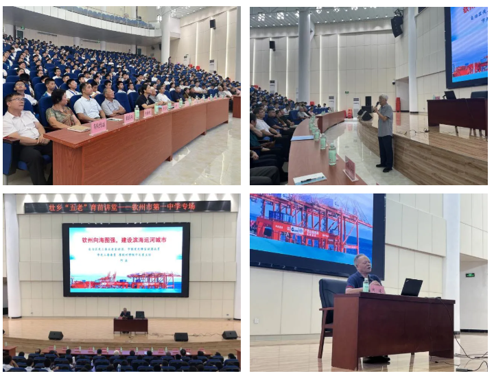 15时30分,讲堂活动正式拉开帷幕。钦州市关工委常务副主任文瑞担任主持人,并简要介绍了活动的背景和宣讲人。市关工委委员、原钦州学院中文系主任何波教授以“钦州向海图强,建设滨海运河城市”为主题,进行了精彩的宣讲。何波教授结合西部陆海新通道建设的宏观格局,运用鲜活的案例展示了钦州的实干担当,如钦州港自动化集装箱码头、华谊化工、中马钦州产业园区、平陆运河工程等,让同学们直观感受到家乡在高质量发展中的活力与动能。